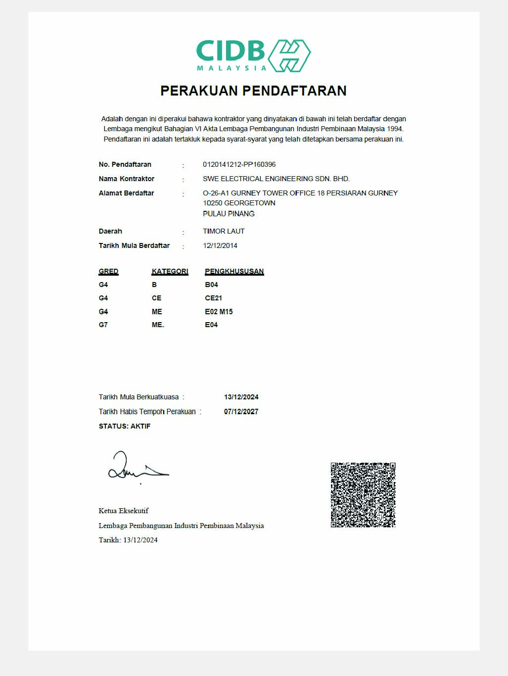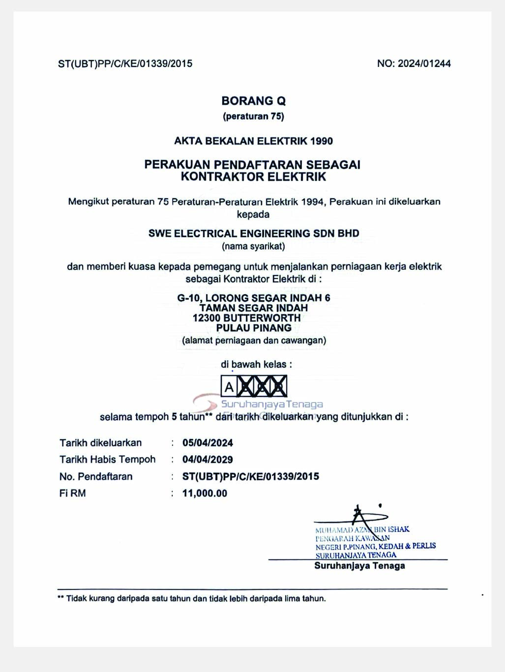 SWE Electrical Engineering Sdn Bhd was officially incorporated in 2013, evolving from our origins as Seng Wong Electrical Engineering, established in 2000. With over 25 years of experience in the field, we have built a solid reputation as a dependable and results-driven electrical engineering contractor in Malaysia.